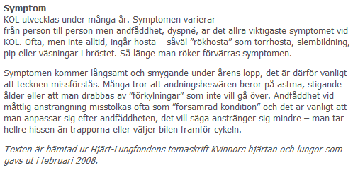 Nej, det är ingen skillnad Publicerat den 5 mars, 20115 mars, 2011 av Paula Tar tillbaka min tolkning. Jag googlade KOL torrhosta å fann detta… Det kan alltså vara KOL när man har torrhosta. Okej, då vet man det…att det inte är nån större skillnad på KOL å lungcancer. Enda sättet att få veta är att gå å undersöka saken. Dela detta: Klicka för att dela på Facebook (Öppnas i ett nytt fönster) Facebook Klicka för att dela på X (Öppnas i ett nytt fönster) X Gilla Laddar in … Related