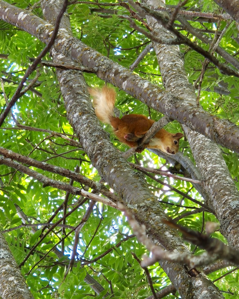 Vi har ekorrar som håller till här i närheten, en mamma med sin unge, som är vuxen nu, men när ungen var liten räddade Håkus livet på den. Den hade fastnat mellan väggen och en hylla, i lilla garaget, med frambenen på hyllan och resten av kroppen hängde ner och den sprattlade och försökte komma lös när Håkus öppnade garageporten. Han hjälpte den lös och den sprang längre in i garaget och vi fick vänta med att stänga igen tills vi var säkra på att den sprungit ut.