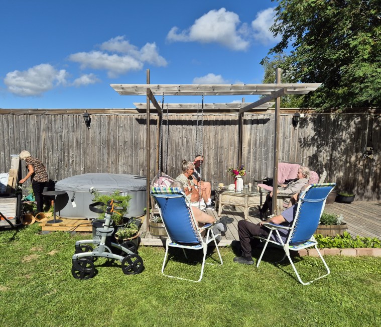 Så länge det är skugga går det bra att sitta i stolarna, tycker Vilma, men så fort solen når dit så söker hon skugga igen. Alma är likadan.